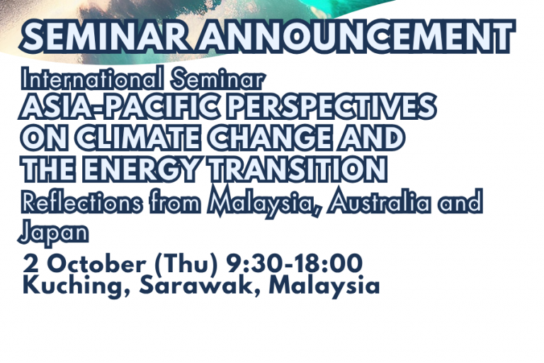 2025年10月2日(木)9:00~18:00、マレーシア・サラワク州・クチン市・Dayak Cultural Foundationにて、セミナー「Asia-Pacific Perspectives on Climate Change and the Energy Transition: Reflections from Malaysia, Australia and Japan」を開催します(学術知共創プログラム事業「重層的アクターの協調を生み出す気候変動ガバナンスの構築」、マラヤ大学、Universiti Malaysia Sarawak、Curtin University Malaysia(豪州)共催)。